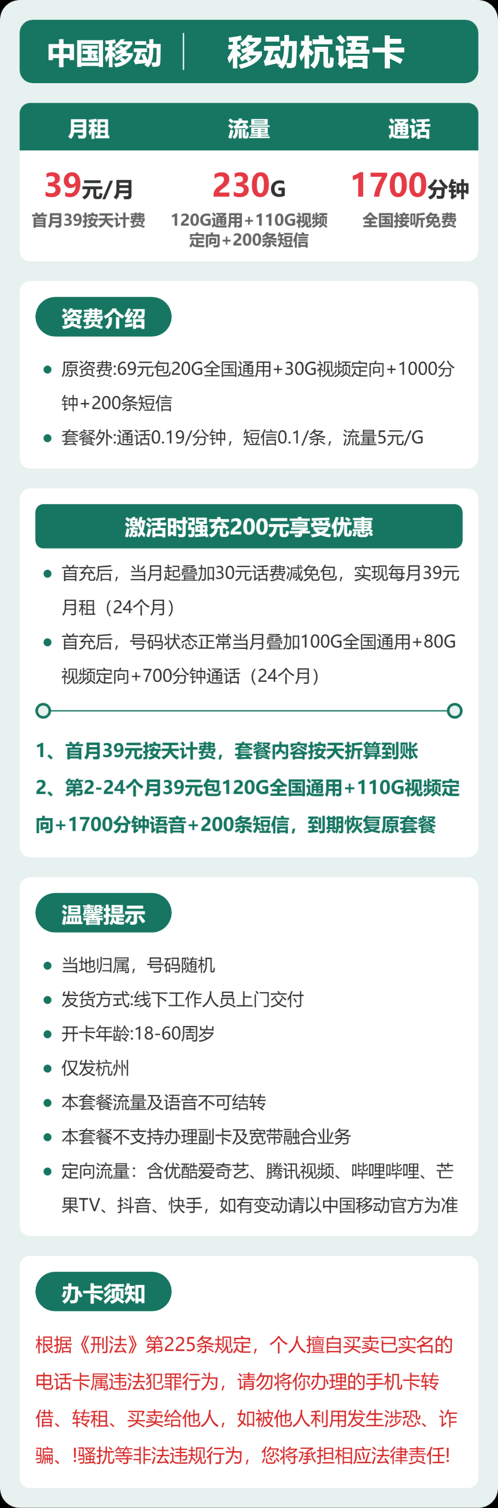 移动杭语卡39元月享230G+1700分钟【仅发杭州】