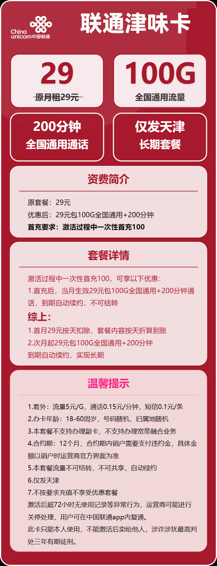 联通津味卡29元月享100G通用+200分钟通话【仅发天津】