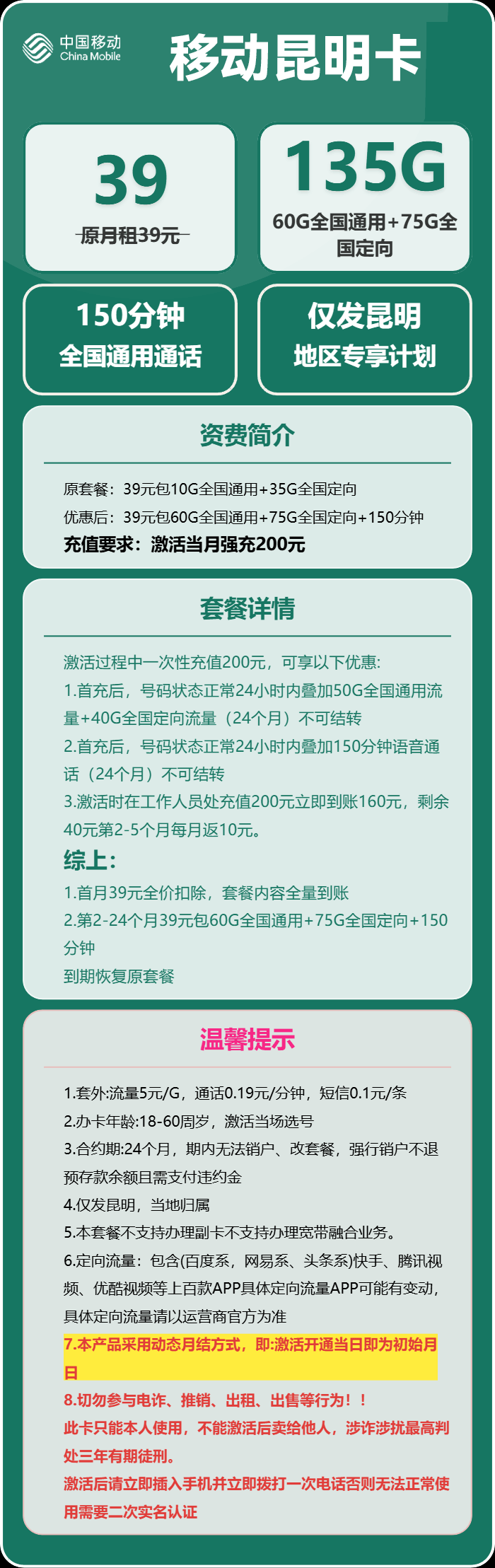 移动昆明卡39元月享135G+150分钟通话【仅发昆明】