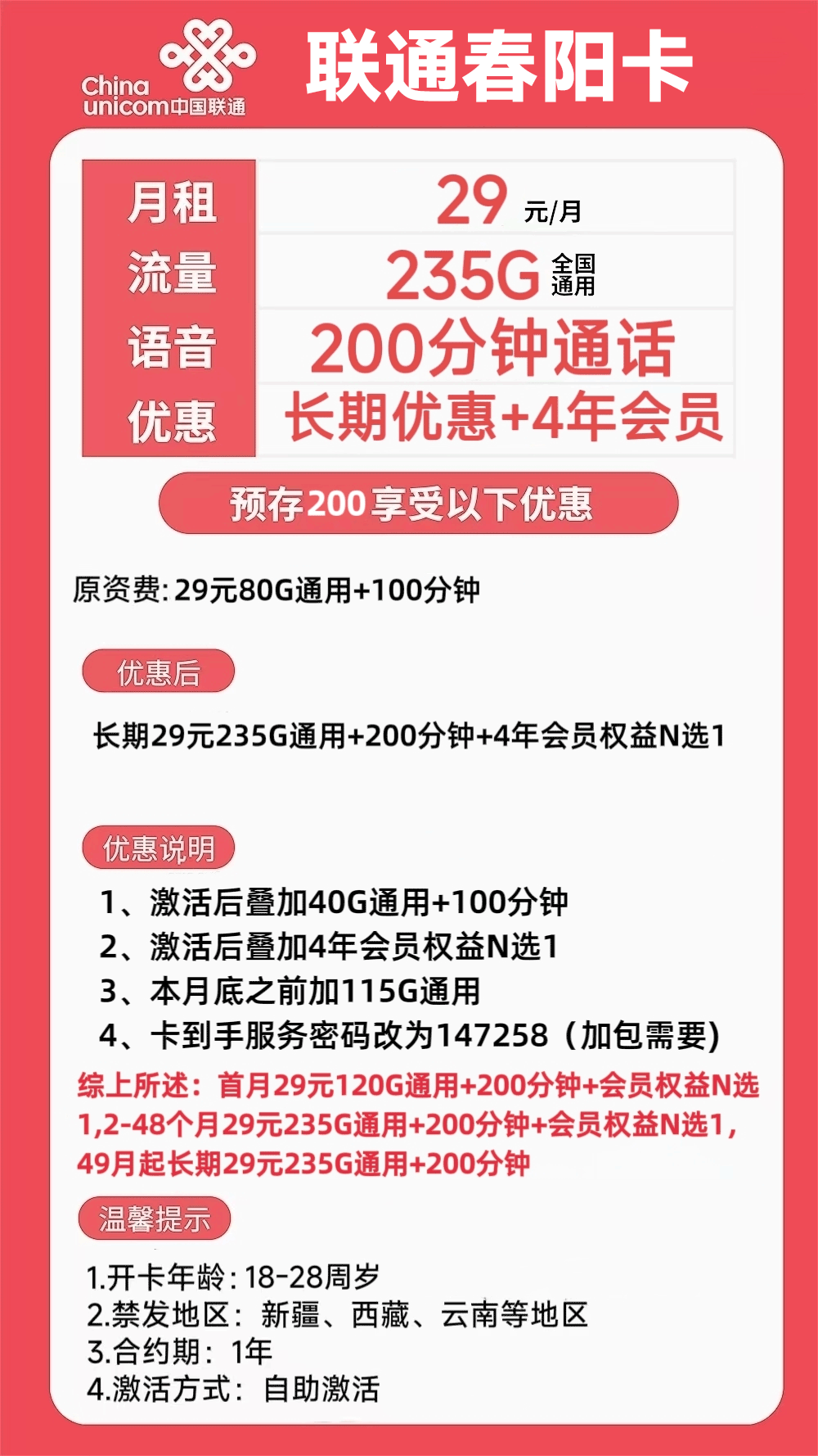 【联通长期】29元月享200G+100分钟