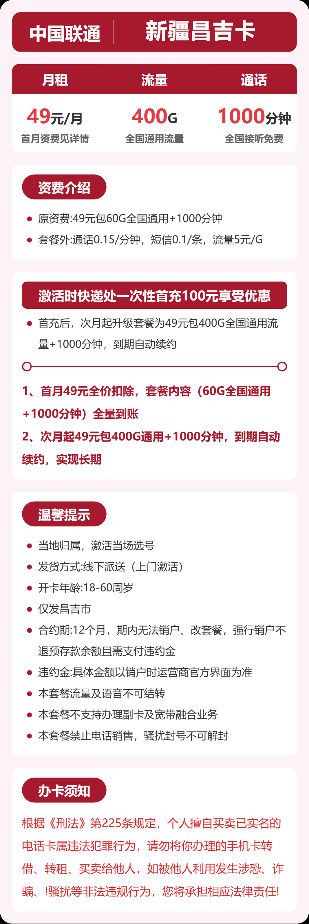联通昌吉卡49元月享400G+1000分钟【仅发新疆昌吉】