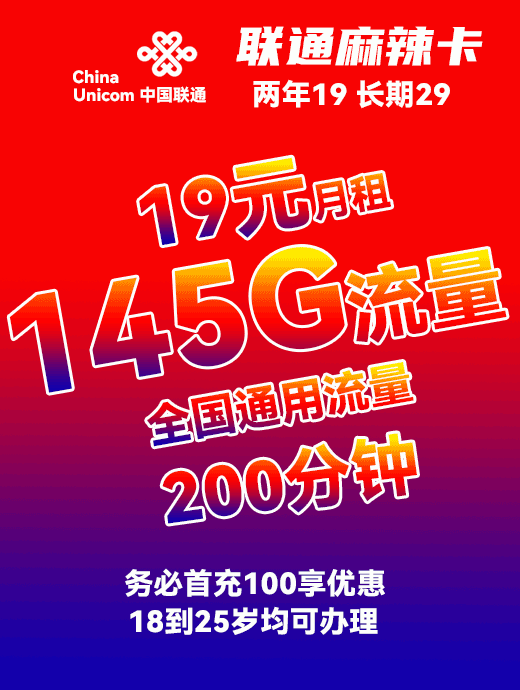 联通麻辣卡19元月享145G+200分钟【18到25岁办理】【两年19 长期29】【发全国】