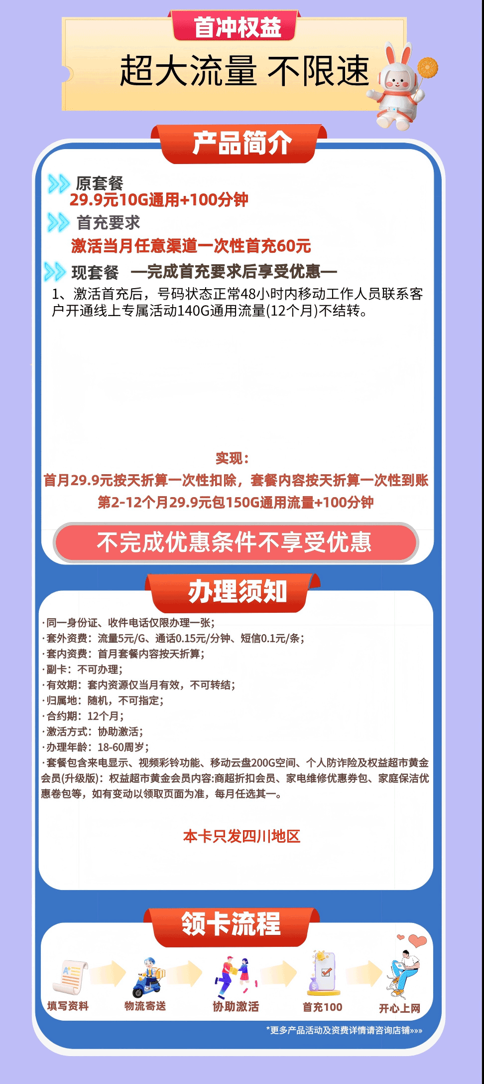 四川移动29.9元月享150G通用+100分钟【只发四川】