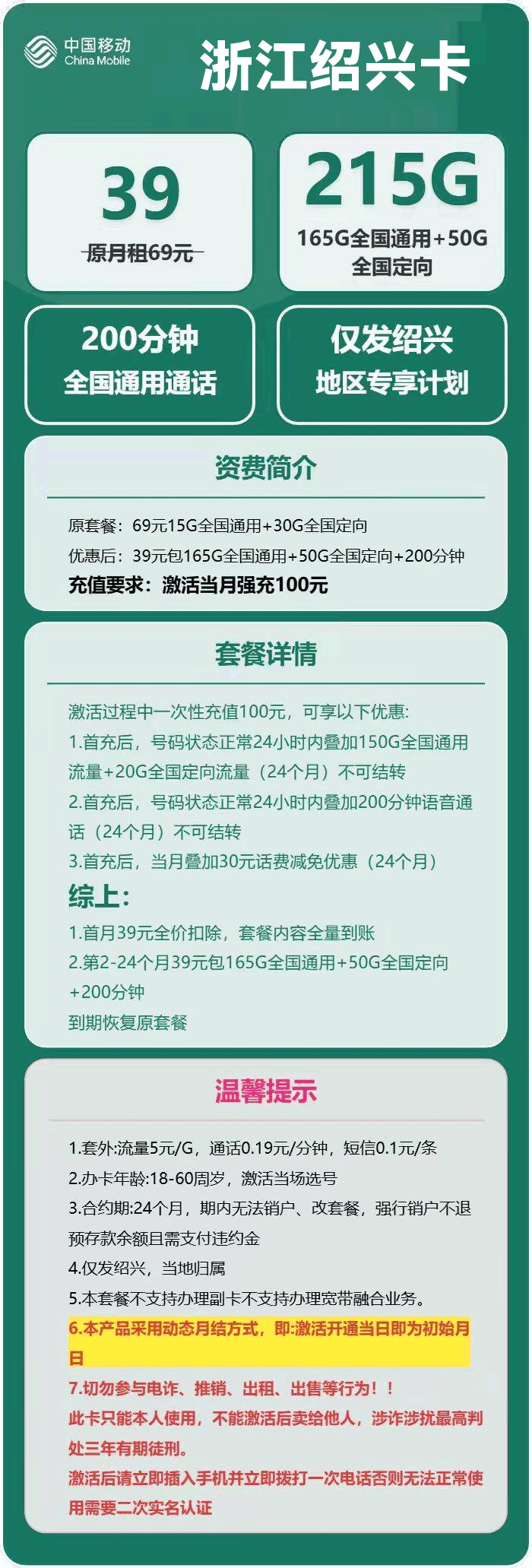 移动绍兴卡39元月享215G+200分钟通话【仅发浙江绍兴】