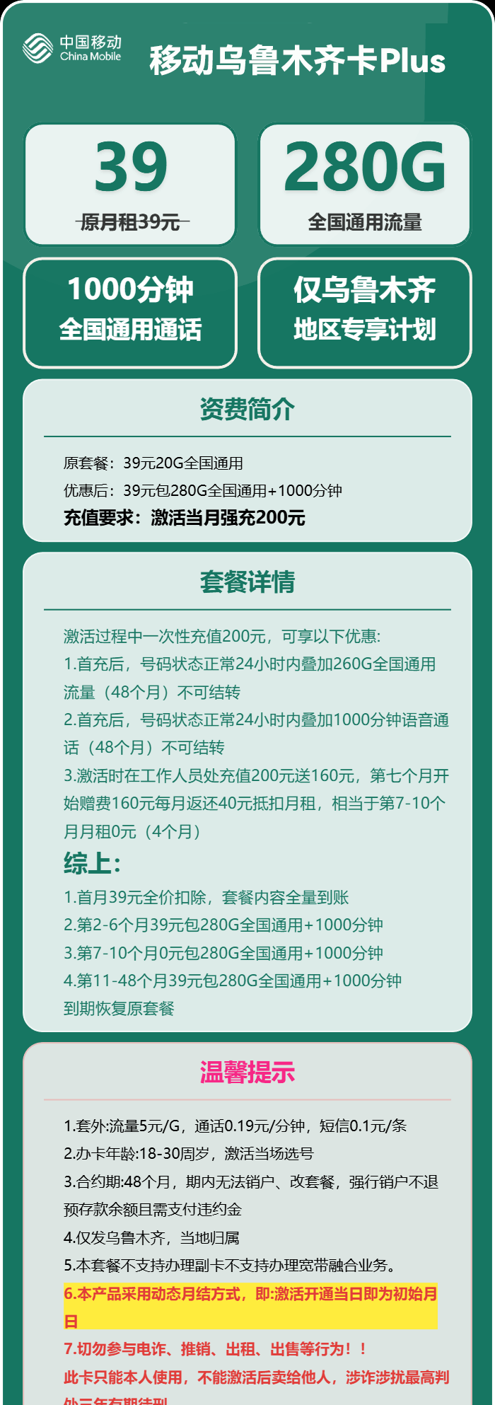 移动乌鲁木齐卡Plus49元月享380G+1000分钟通话【仅发新疆乌鲁木齐】