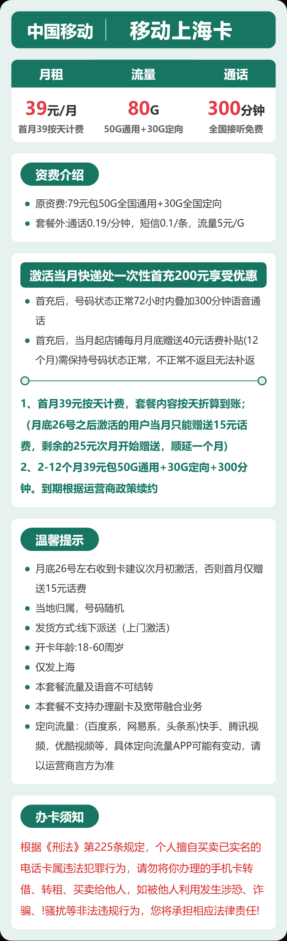 移动上海卡39元月享80G+300分钟【仅发上海】【免费领取】