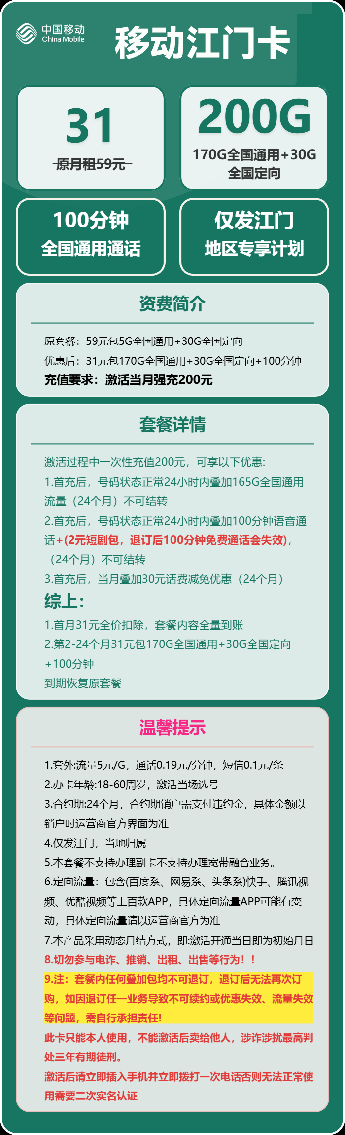 【深圳移动】39元月享210G+100分钟
